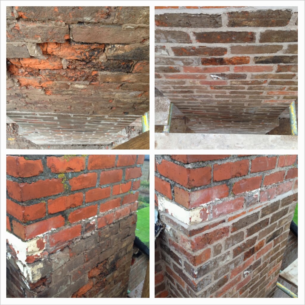 Once we had access to this chimney it was quickly apparent that it would need major attention - more so than originally thought. The mortar was extremely damaged and looks like a very weak mixture had been used in previous repairs. This leaves only one sensible option - a complete rebuild of this chimney which will start next week. The chimney stack will be taken down to roof level and completely rebuilt using a suitable lime mortar and repaired with reclaimed bricks to match the present style. We think there may be a total of 4 flues, with 2 currently hidden beneath the flaunching. If thats the case, we will probably install 4 pots to restore the original look of this big stack.